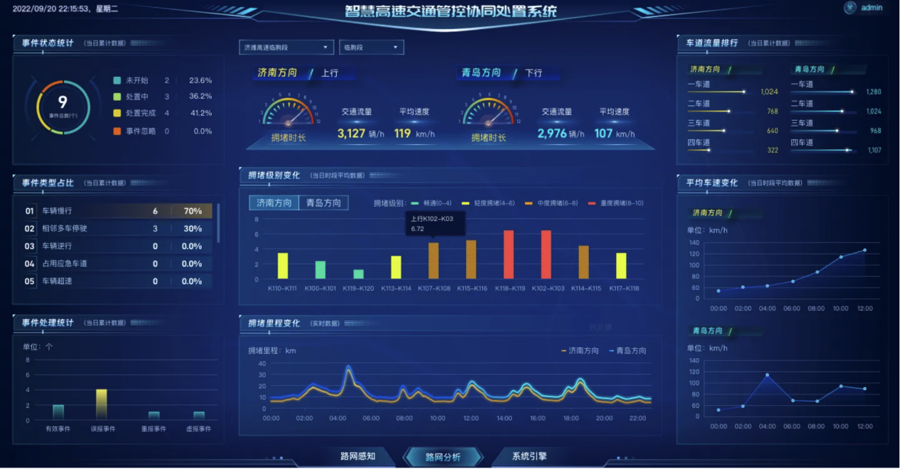 监测高速路网通行状态、路面事件、指标变化趋势。传统路网管理主要依靠人工巡查,少量道路拥堵、交通事故、路面异物等不能被第一时间发现,为路网管理带来困难。路网监测基于前端感知设备确保第一时间发现事故、拥堵、违停等路况事件,克服人工监测和车辆巡查的短板,提高安全处置效率。路网感知以地图作为主界面,通过地图展示事件信息和路况信息从而感知路网运行情况。
