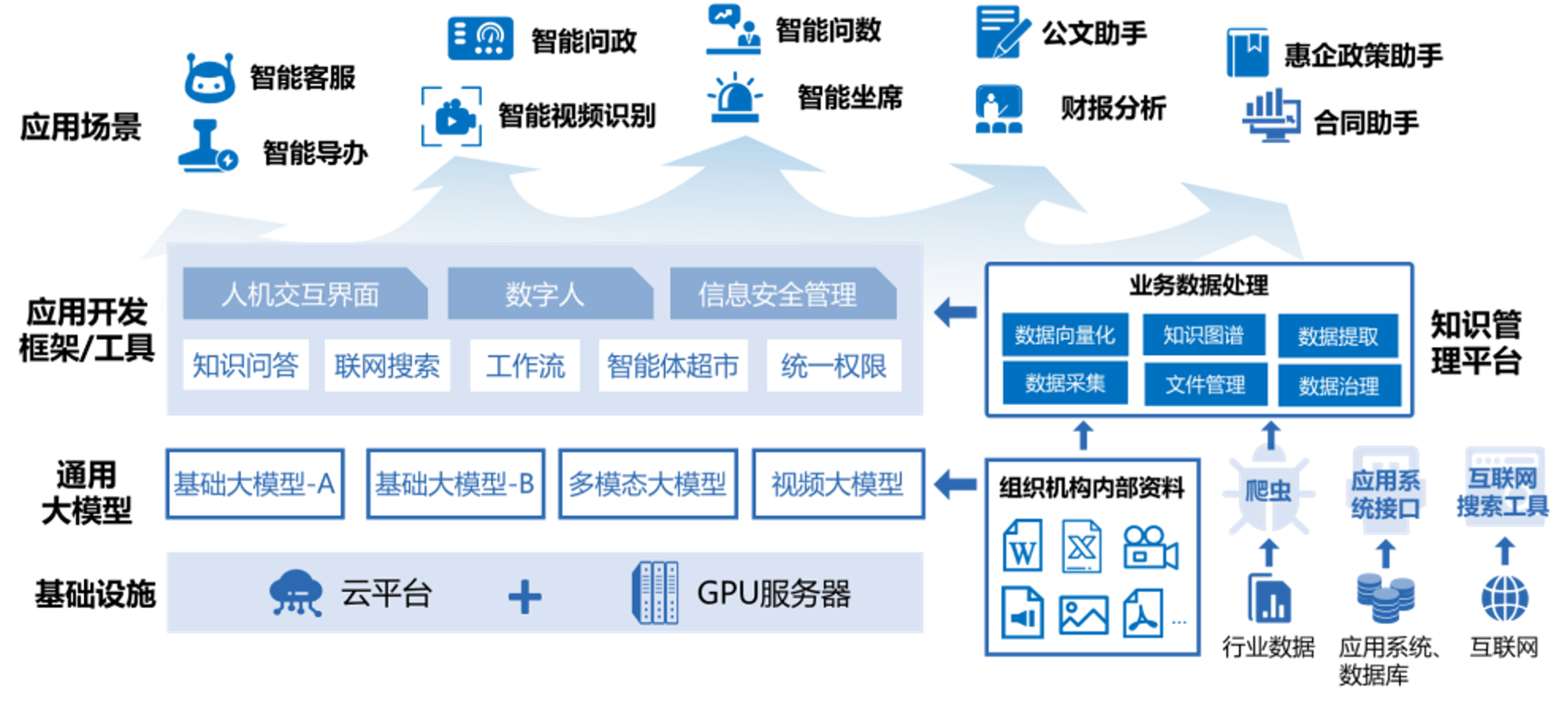 针对政府部门信息安全需求,大模型政务领域k8凯发官网首页的解决方案采用私有化部署的方式,综合应用多模态数据处理、rag(检索增强生成)、kag(知识增强)、ai agent等技术,将大模型与政务领域的数据充分融合,构建政务管理及服务的创新应用场景。 方案技术架构总体分为算力基础设施、知识管理、应用开发和创新应用场景四个部分。底层是算力基础设施,可以采用私有化部署的服务器,也可租用云平台的智算资源,并灵活部署多种大模型产品。在此基础上,知识管理层对来自政府内部、社交媒体、互联网、公共数据库及业务系统等多源异构的行业数据进行统一汇聚、加工与处理,为大模型检索行业知识提供丰富的数据来源;应用开发层则提供智能体构建的统一技术框架,内置丰富的开发工具和应用组件,针对不同的业务需求,以可视化界面和拖拉拽的操作方式灵活构建各类智能体,并配合“边开发边调试”的敏捷开发模式,大大降低了智能体的技术开发门槛;应用层面针对政务领域的业务需求,可以构建“智能客服、智能问政、智能问数、公文助手、政策助手、事件智能识别、智能坐席、合同助手”等一系列创新应用场景,为用户带来更智能、高效、个性化的大模型服务。