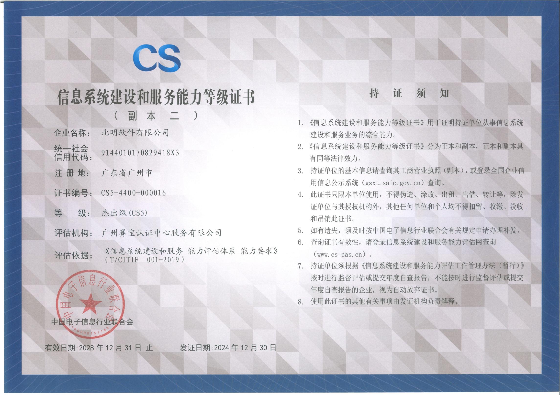 信息系统建设和服务能力评估体系(简称cs)是衡量企业信息化建设服务能力的重要标准,cs5级作为最高等级,代表着企业在战略管理、技术创新、项目管理、服务质量等多方面均达到行业领先水平。此次获此殊荣,意味着北明软件在信息系统领域的技术实力及服务质量得到国家级认可,彰显了公司综合实力及市场竞争力的显著提升。